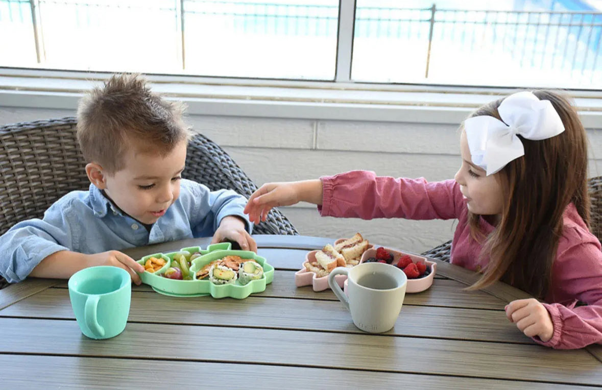 - Dividers keep food separated, help kids scoop their food independently, and gently remind to serve a balanced meal