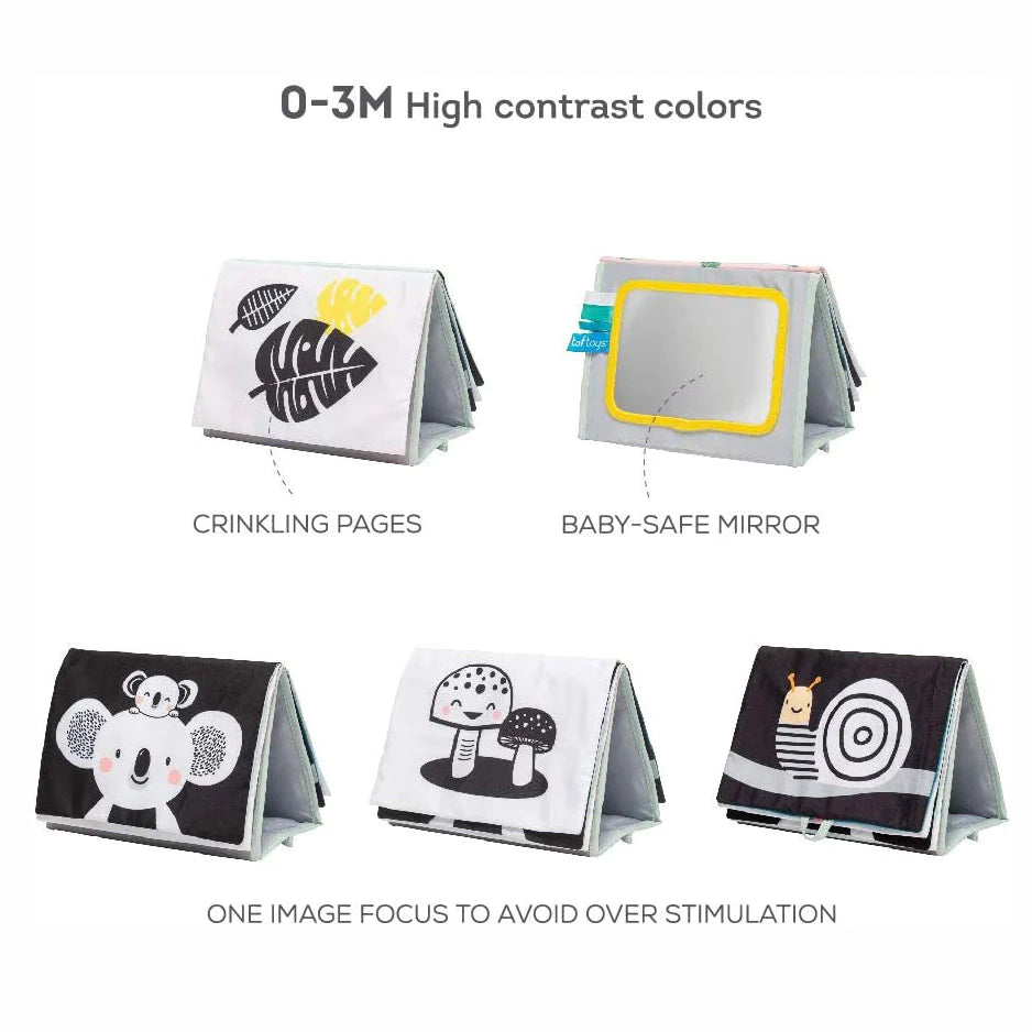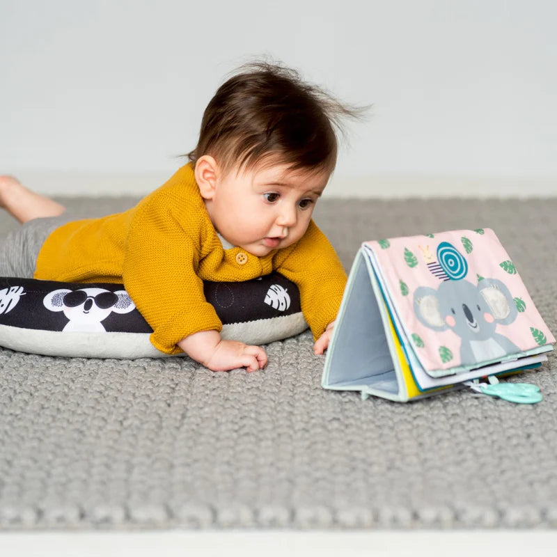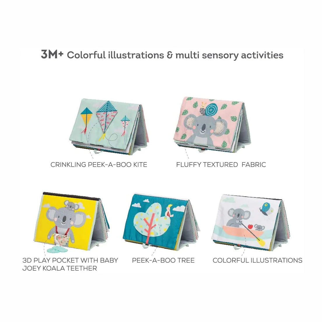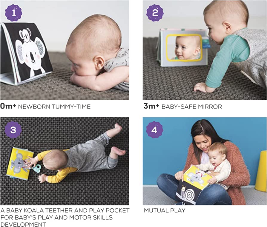 - Crinkling pages for 2 development stages includes: baby-safe mirror, crinkling shapes, 3D activities and textured fabrics and with Joey baby koala teether toy cuddled in his mamma's pouch