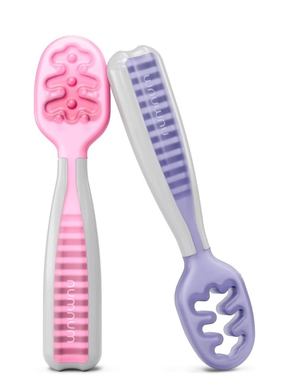 - Baby Feeding For First Stage + Second Stage: Set Includes: Stage One GOOtensil for beginners (also acts as a teether for sore gums) + Stage Two GOOtensil toddlers capable of the food-to-mouth motion.